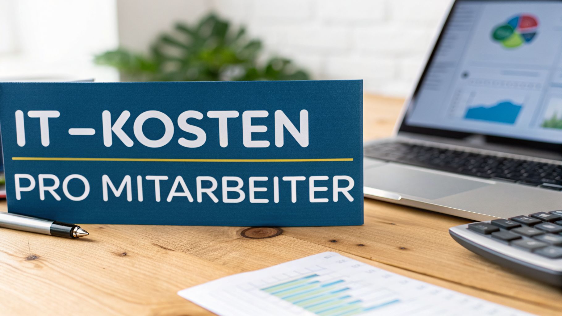 Ein Arbeitsplatz mit Laptop, Dokumenten, Taschenrechner und Kaffee. Überlagerung mit der Aufschrift 'IT-Kosten Pro Mitarbeiter'.